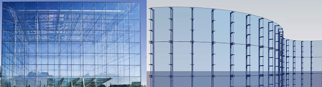 The system, which holds the glass by means of visible metal parts, which only cover a small part of the glass surface the fixing holes are drilled and counter sunk, countersunk bolts are embedded in the thickness of the glass, for small and medium glazing not exceeding seven meter in height and fifty meter in length, rigid bolted system or clasped glazing can be used but with care in design and installation. In modern bolted system knuckled bolts for the fixing of the lass are being used, instead of common fixed bolt. Knuckled bolts allow the glass. Submitted to wind pressure, to be flexible and make a continuous curve instead of a double curvature. It limits sensible the tension in the glass at suspension points. Bolted glass system is often used on main entrances elevation of the big buildings, so that any body can have unhindered view into the building.